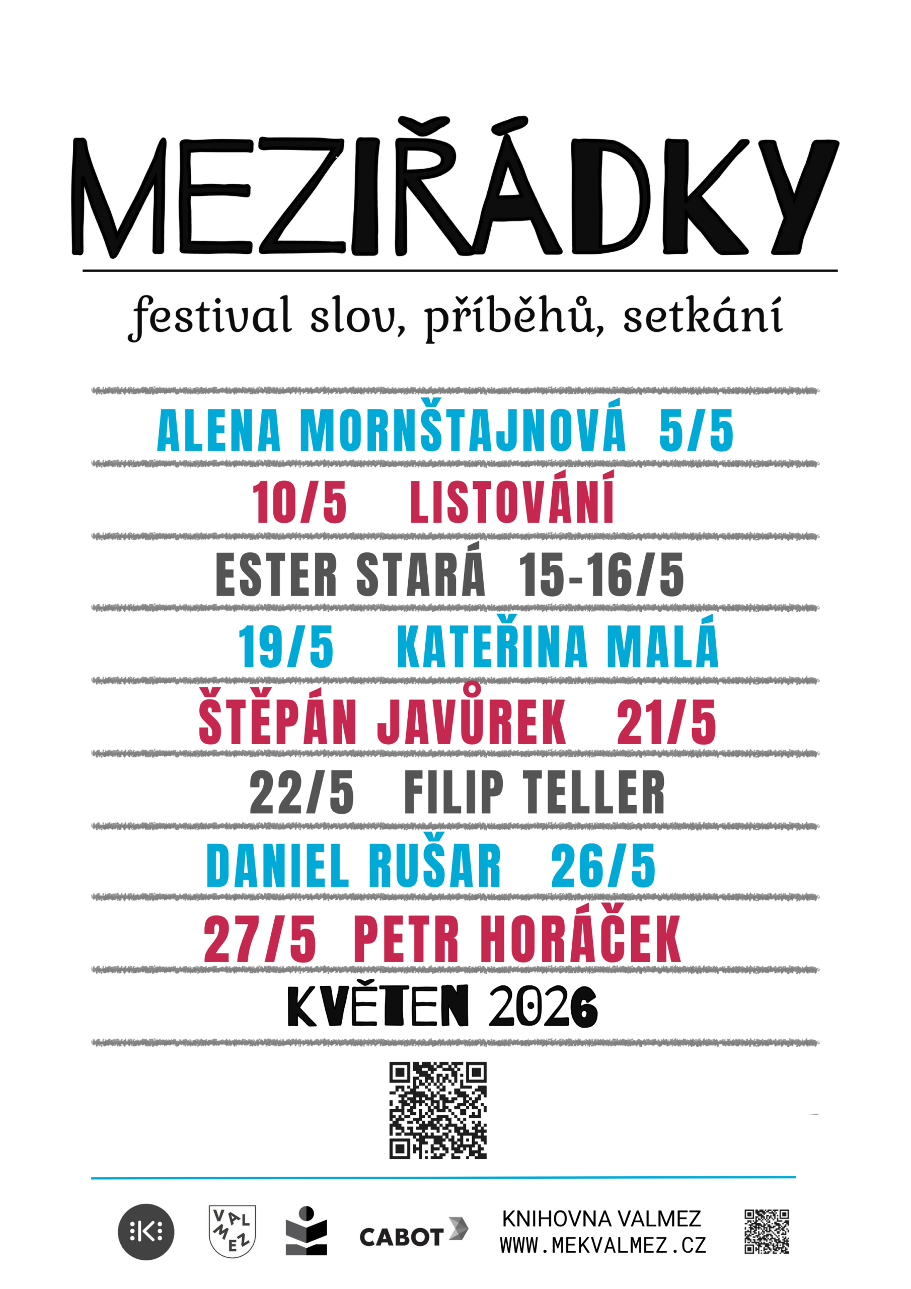 V květnu se naše knihovna promění v místo setkávání s příběhy, autory a ilustracemi. Festival Meziřádky nabídne několik týdnů programu pro děti, školy i dospělou veřejnost – autorská čtení, besedy, workshopy, divadelní představení i výstavy. Festival přiveze do Valašského Meziříčí řadu výrazných osobností literatury, ilustrace i práce s příběhem. Návštěvníci se mohou setkat se spisovatelkou […]